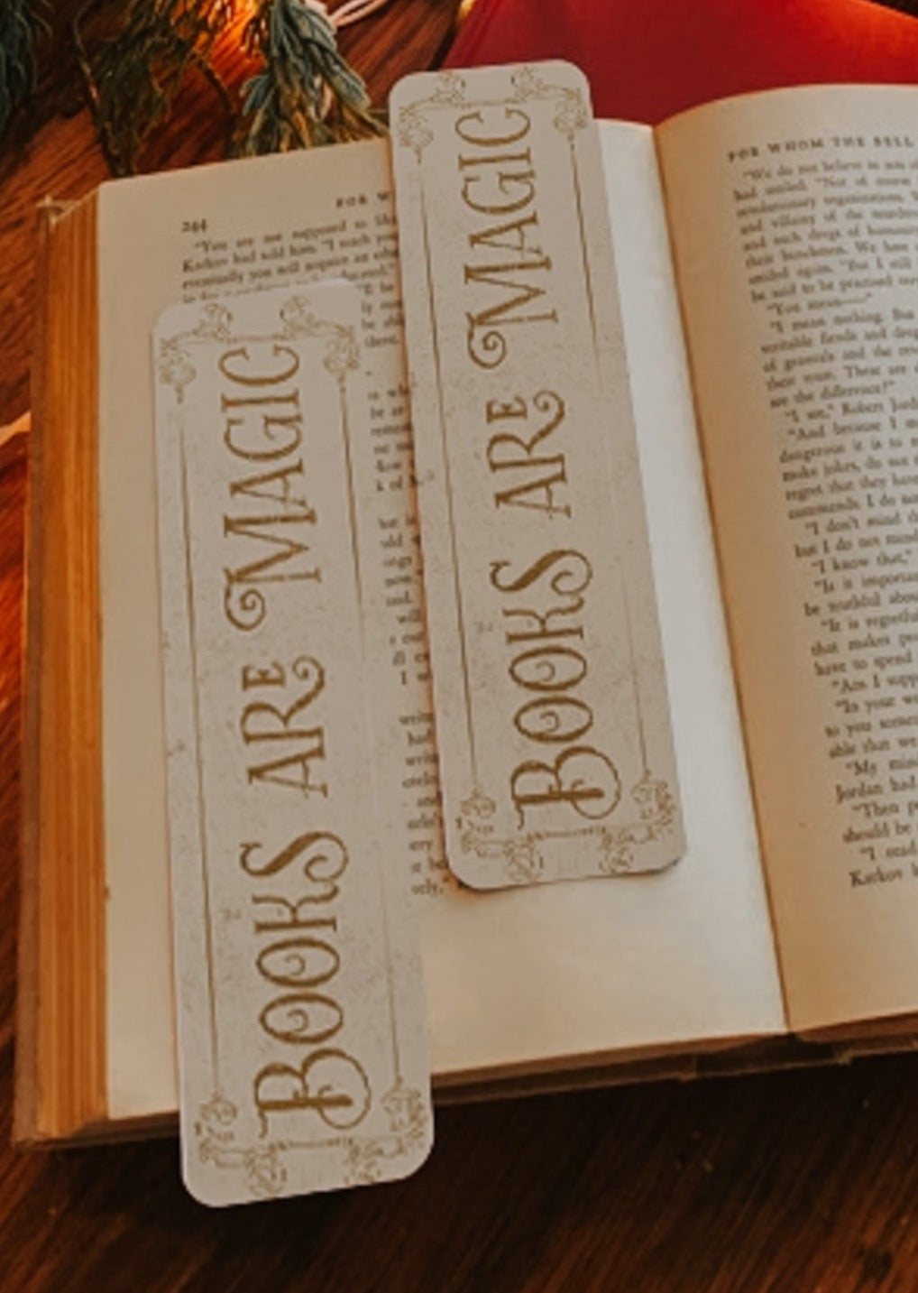 A cozy cream-colored bookmark adorned with the text "books are magic"