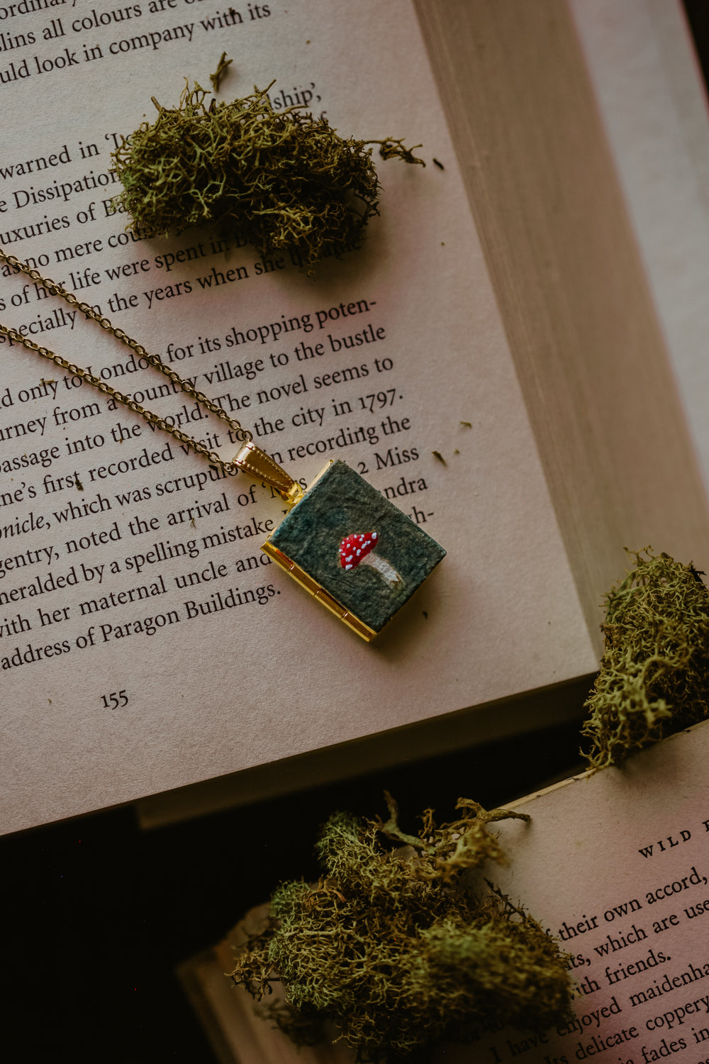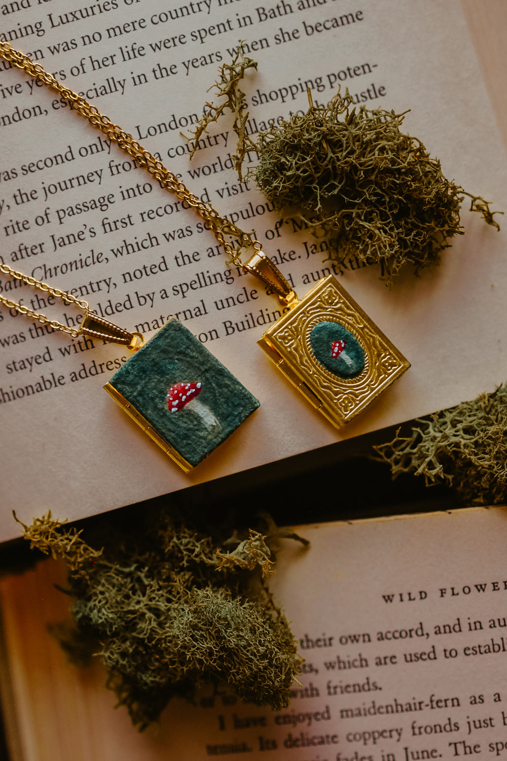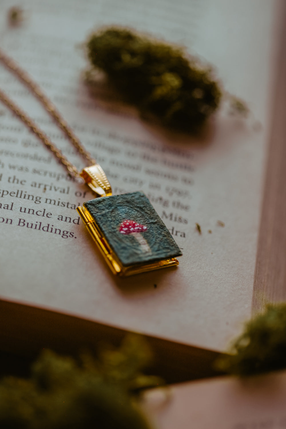 Handpainted watercolor mushroom on a gold-plated locket. Painting was painted directly onto the locket using watercolor ground and a teeeeny tiny brush.