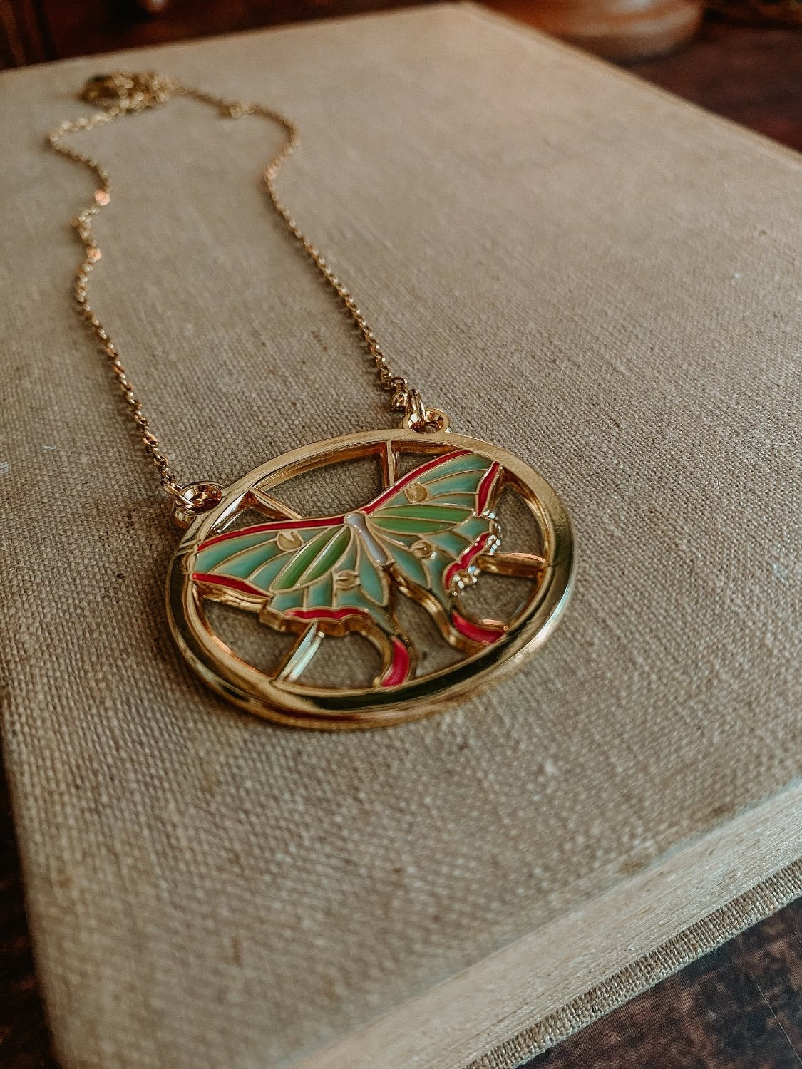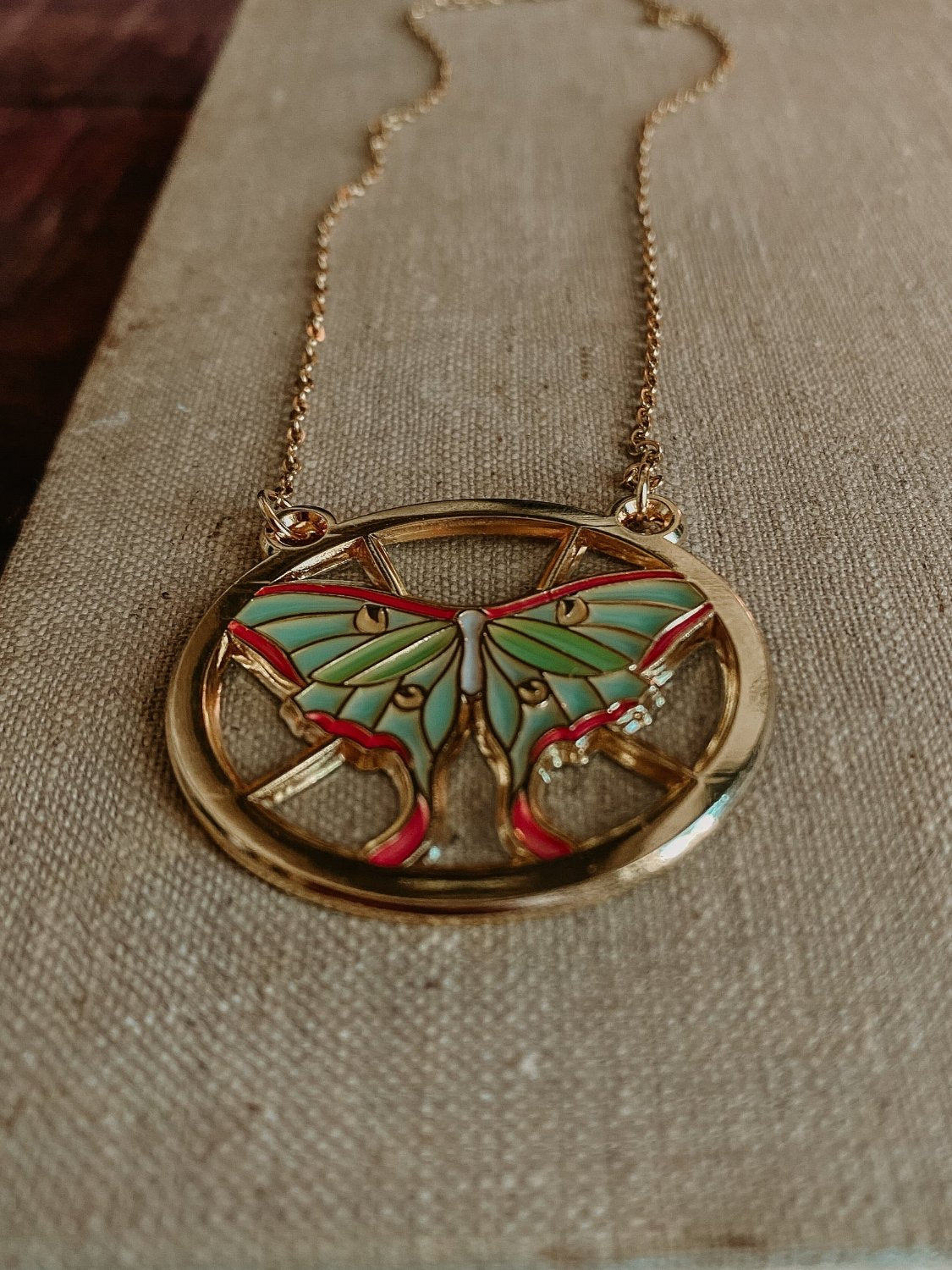 Inspired by the beauty of stained-glass, this necklace features a lunar moth that is semi-transparent and shines when held up to the light.