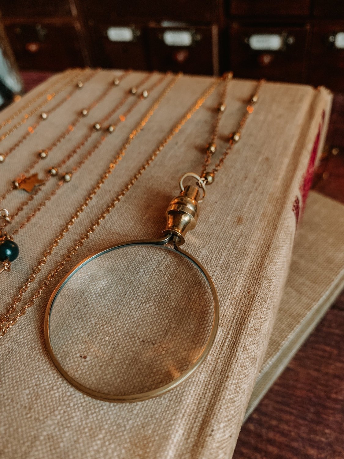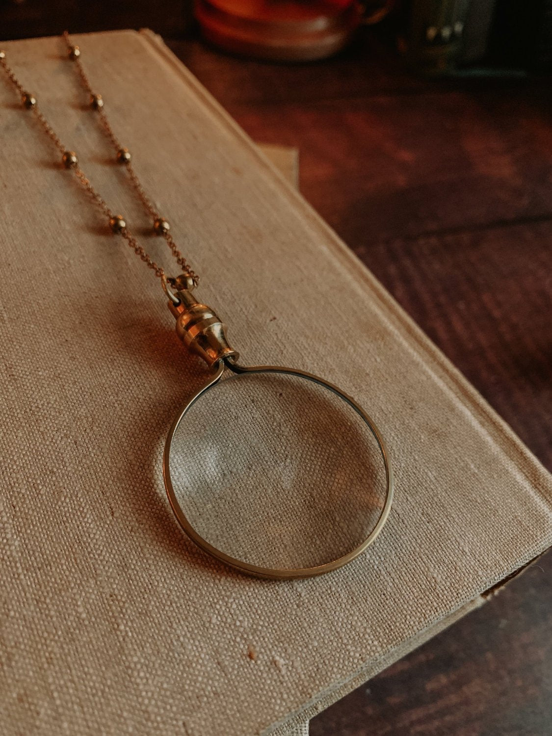 The magnifying glass necklace is made of rustic raw brass and features a magnifying glass.