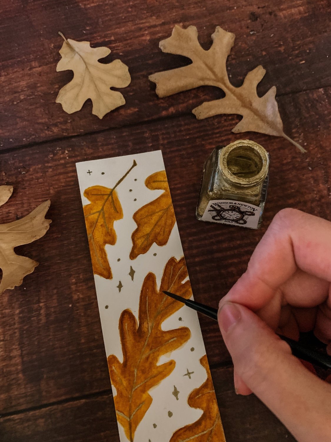 Hand-painted bookmarks of falling maple and oak leaves.
