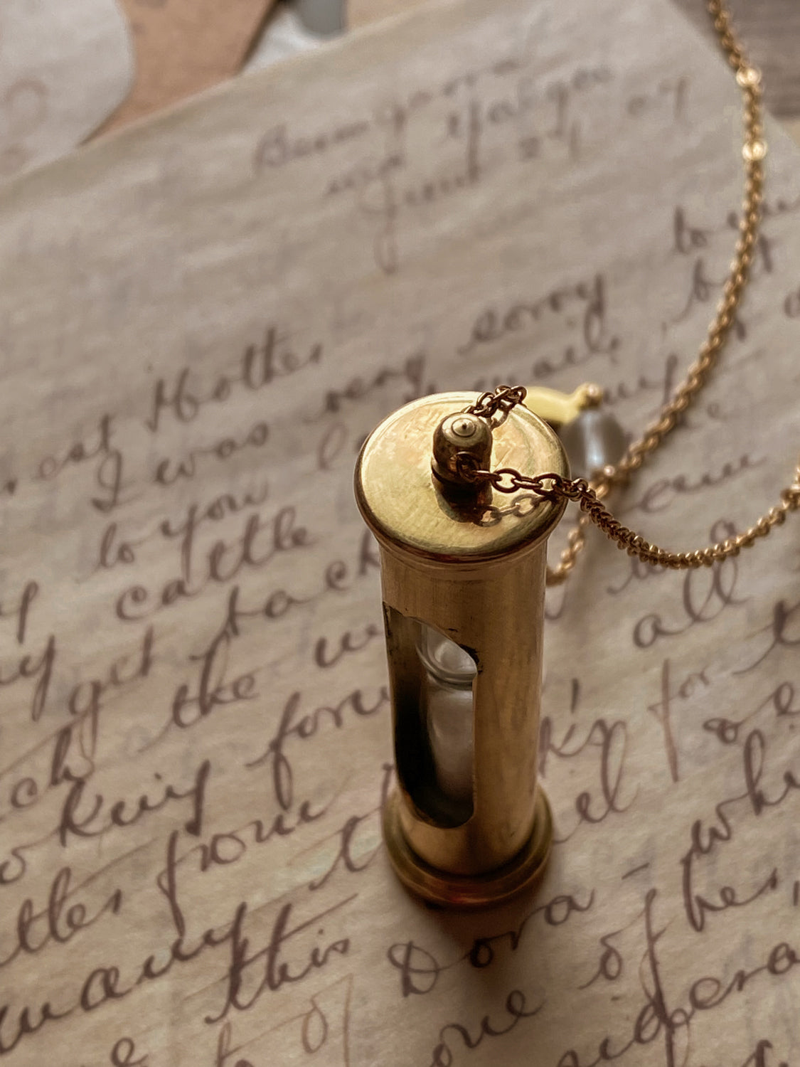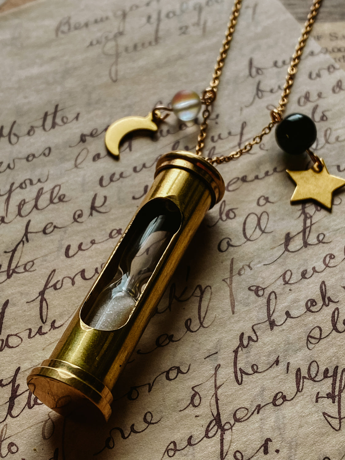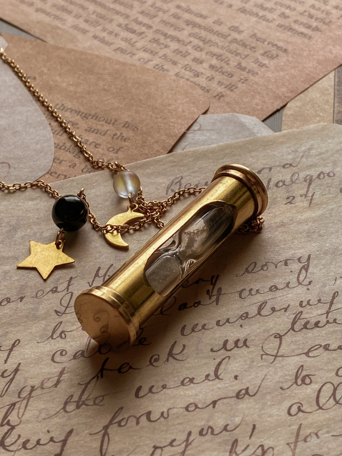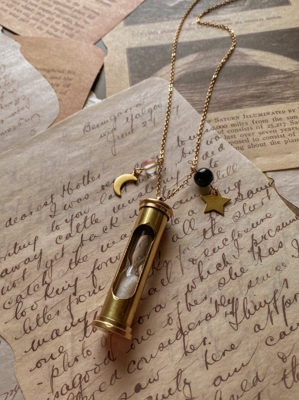A whimsical necklace of a vintage sand timer that works when you turn it.