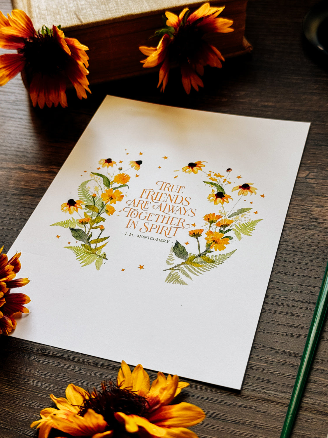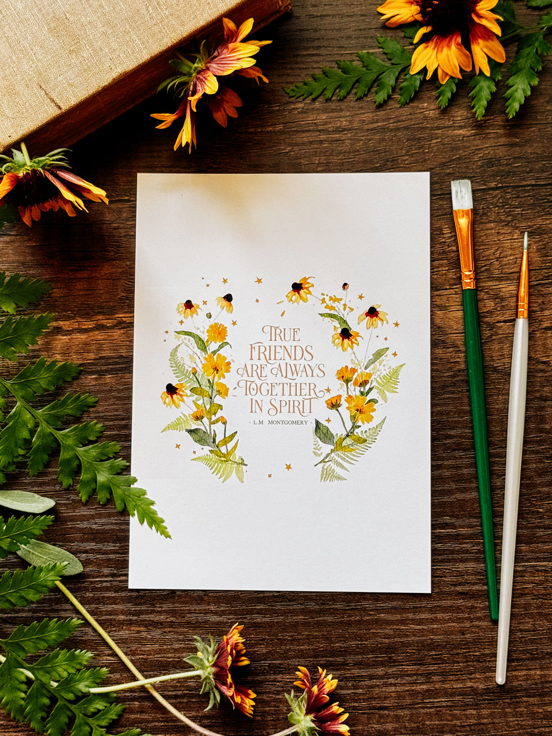 A watercolor painting featuring the quote from Anne of Green Gables, “True friends are together in spirit”.