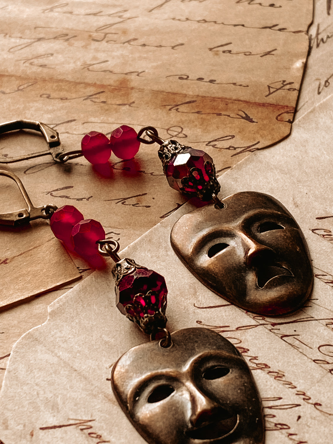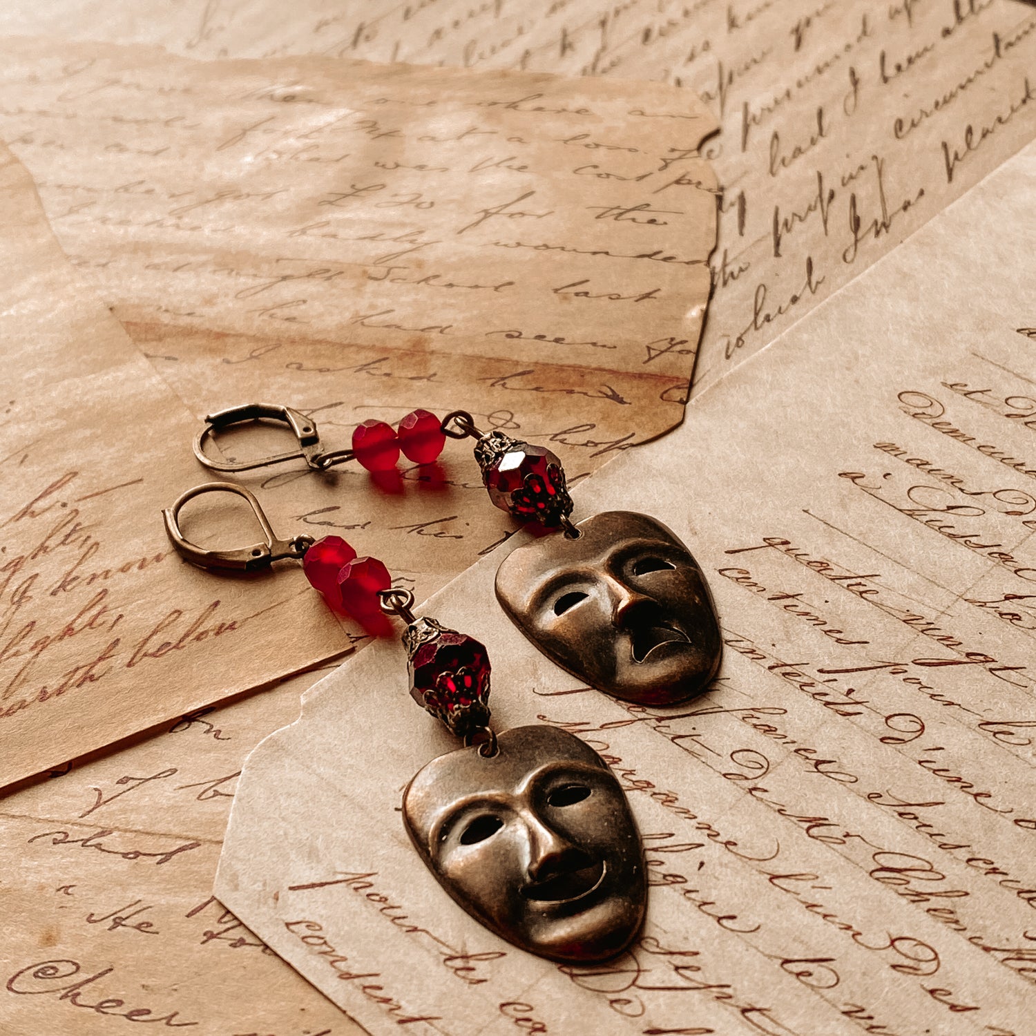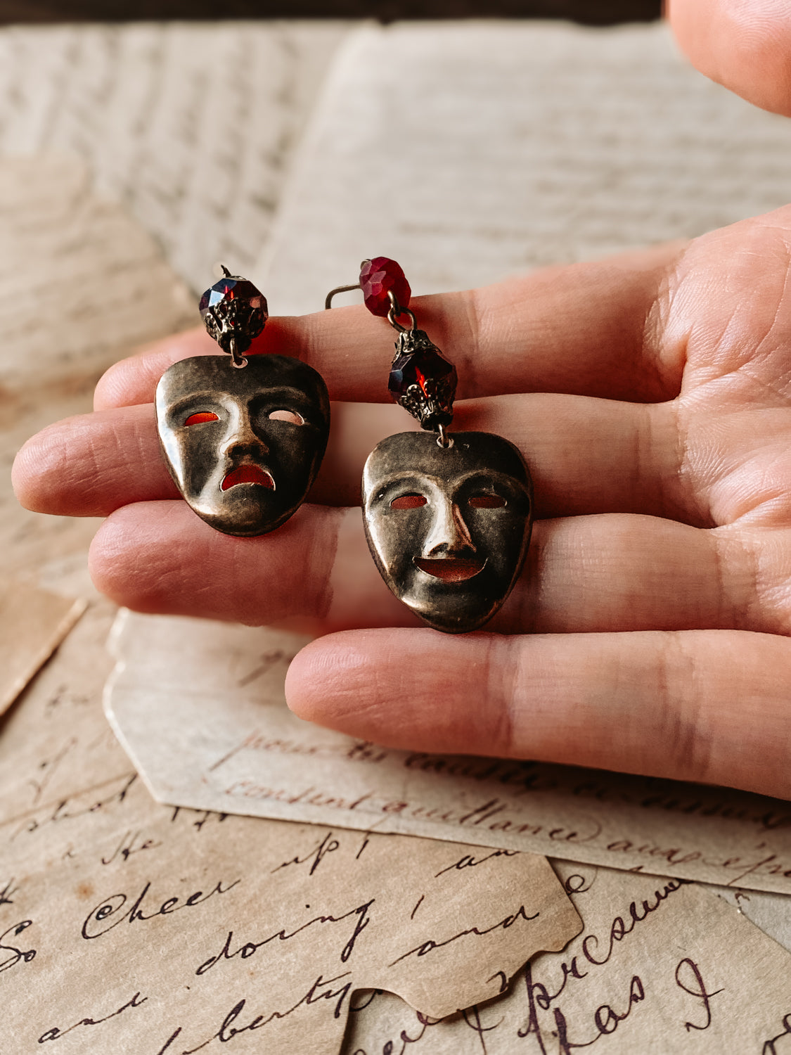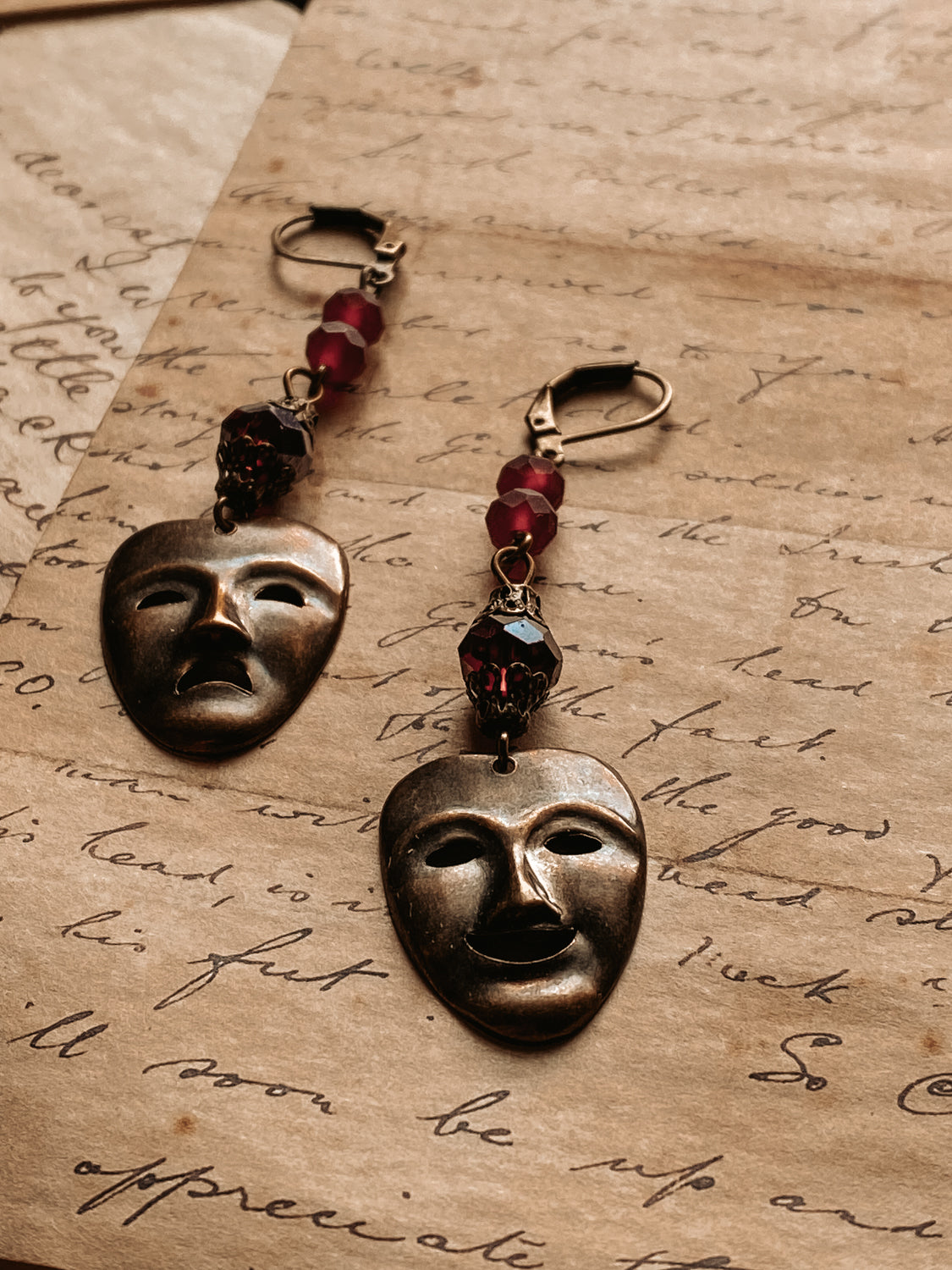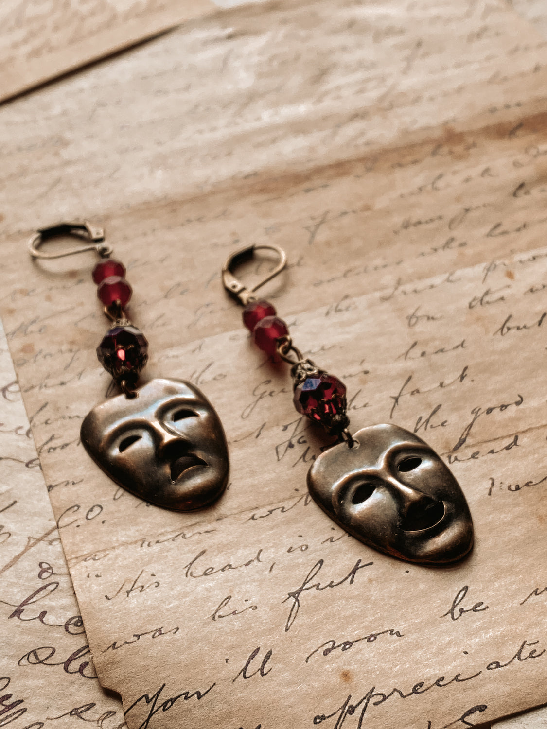 A set of dangle earrings including one comedy and one tragedy.