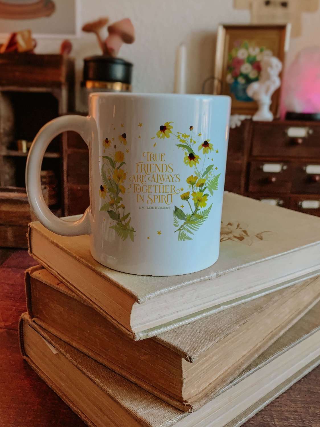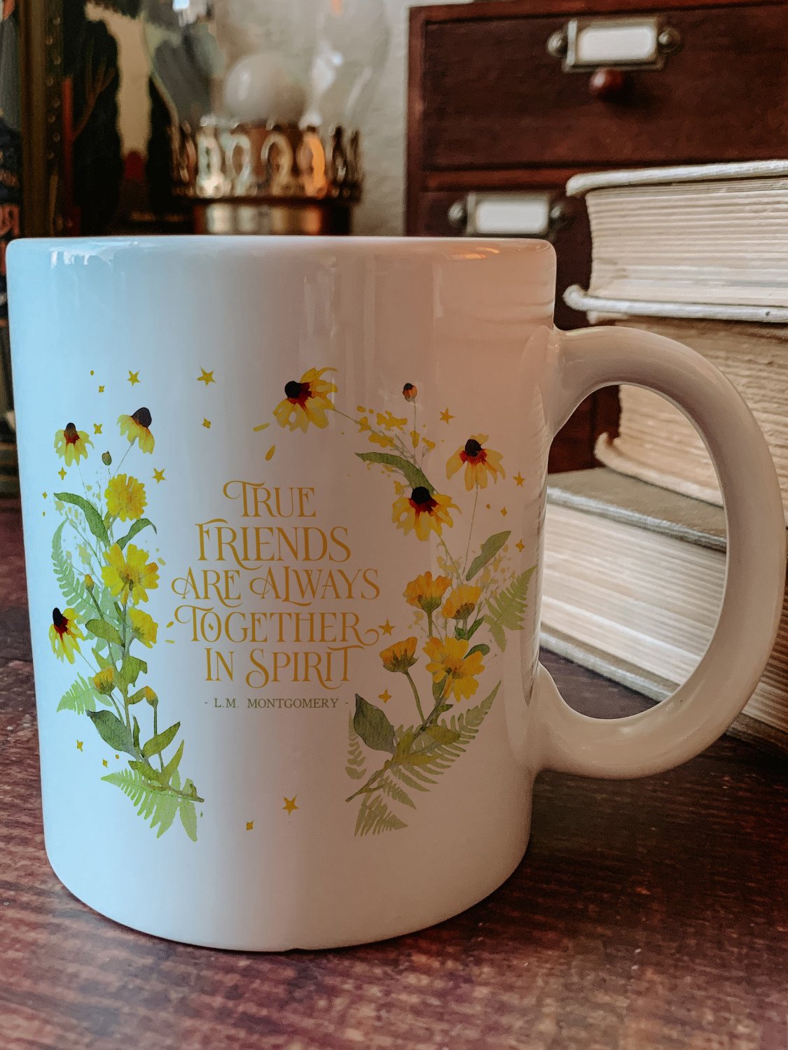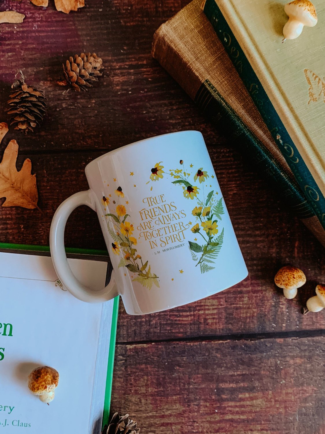 A ceramic mug with the Anne of Green Gables quote "True friends are always together in spirit".