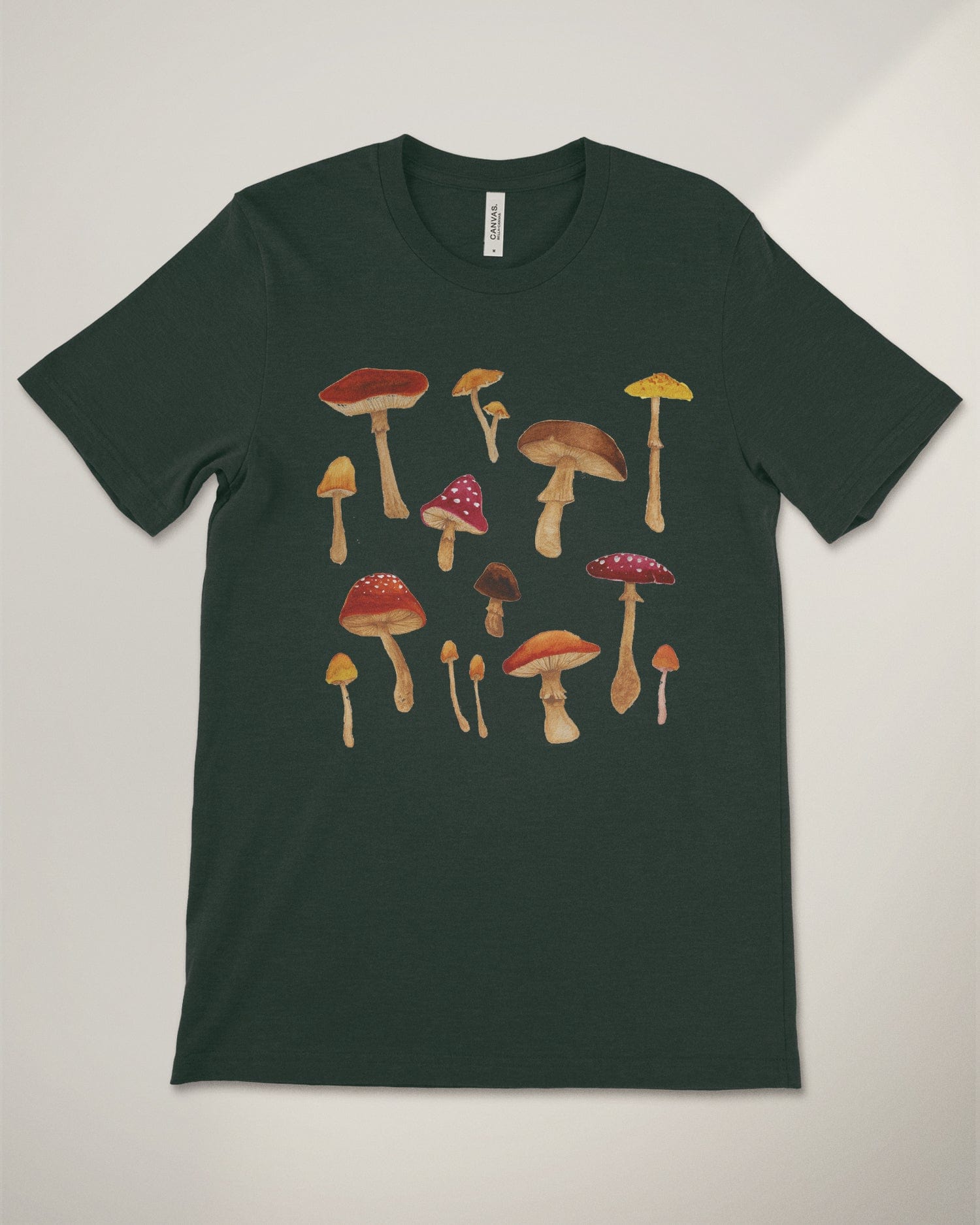 A collection of warm-hued mushrooms, originally painted using watercolor on paper.